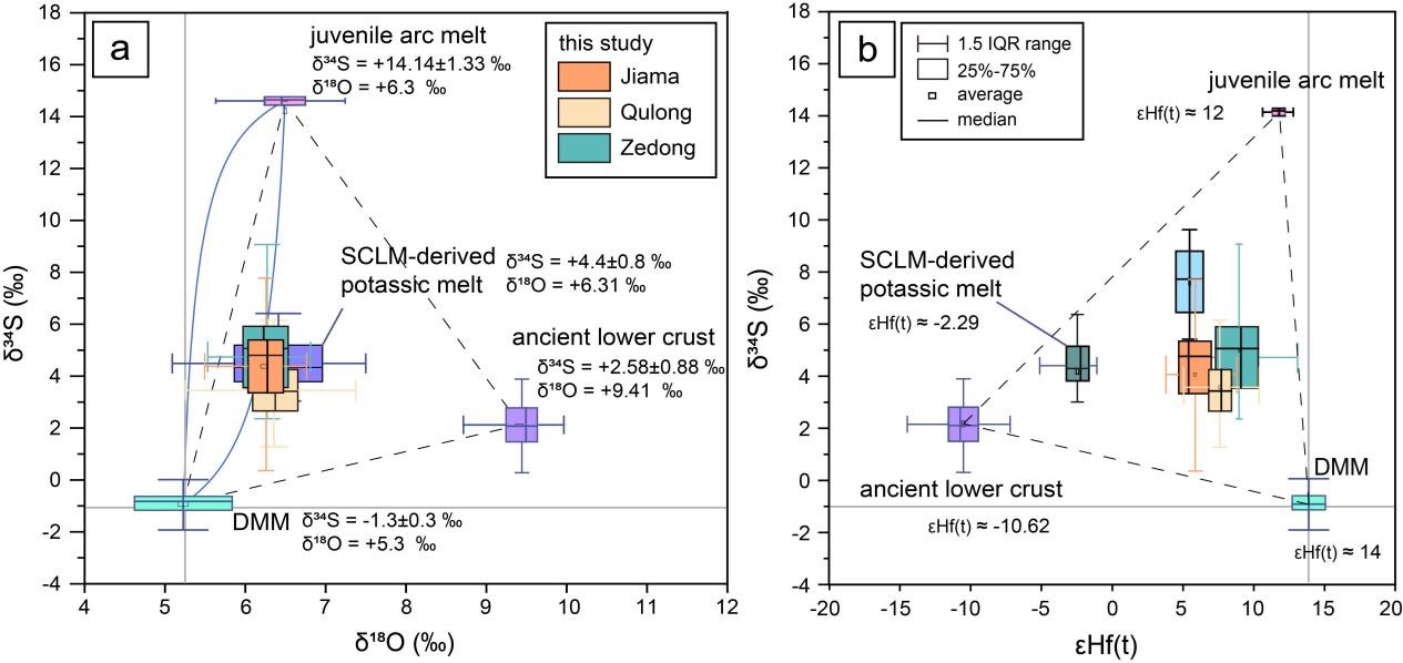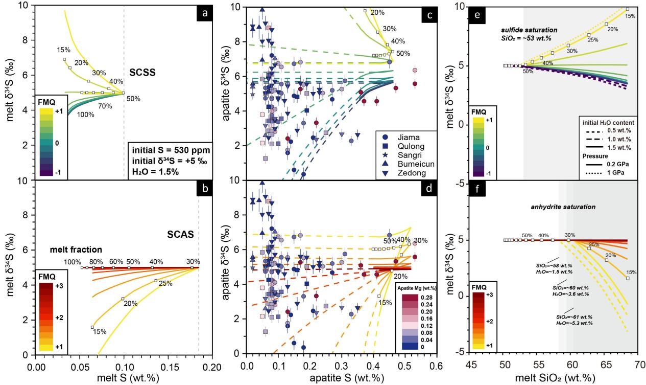 斑岩矿床的形成需要较高的氧逸度、较高的硫(S)含量和水含量等,但斑岩成矿岩浆的S如何在壳内演化还存在一些争议。例如一些工作指出地壳深部起源的岩浆发生硫化物早饱和是比较普遍的现象,这与碰撞带能够形成大型斑岩矿床的事实相悖。厘定斑岩矿床的S壳内演化,限定矿床中S的来源是理解成矿作用至关重要的话题。