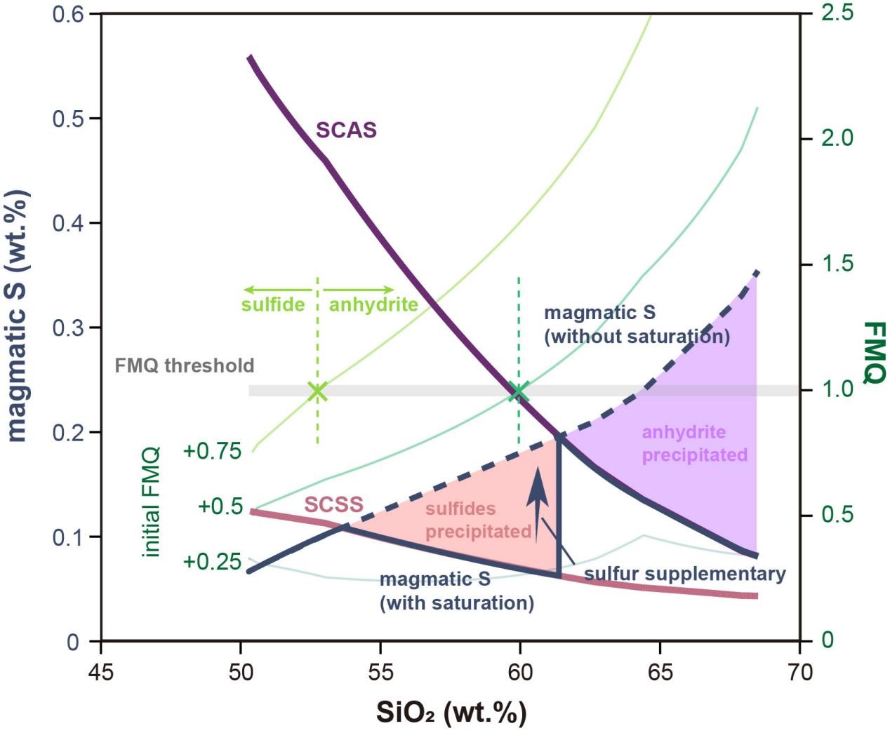 (3)模拟计算表明,同等岩浆条件下,硫化物饱和阈值(SCSS)恒定低于石膏饱和阈值(SCAS)(图5)。这意味着岩浆在达到石膏饱和前一定会先达到硫化物饱和(一定氧逸度范围内),岩浆达到石膏饱和所需的S含量,可以来自于早期硫化物再利用,也可以来自于持续的幔源岩浆补充。