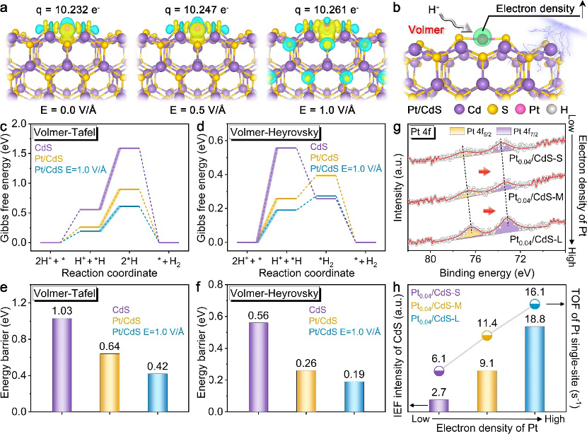 1. 极化诱导电子重排:利用CdS的定向极化电场作为微观“调节器”,有效极化了Pt单原子的原子电荷分布,精准调控了Pt的化学态与电子结构。