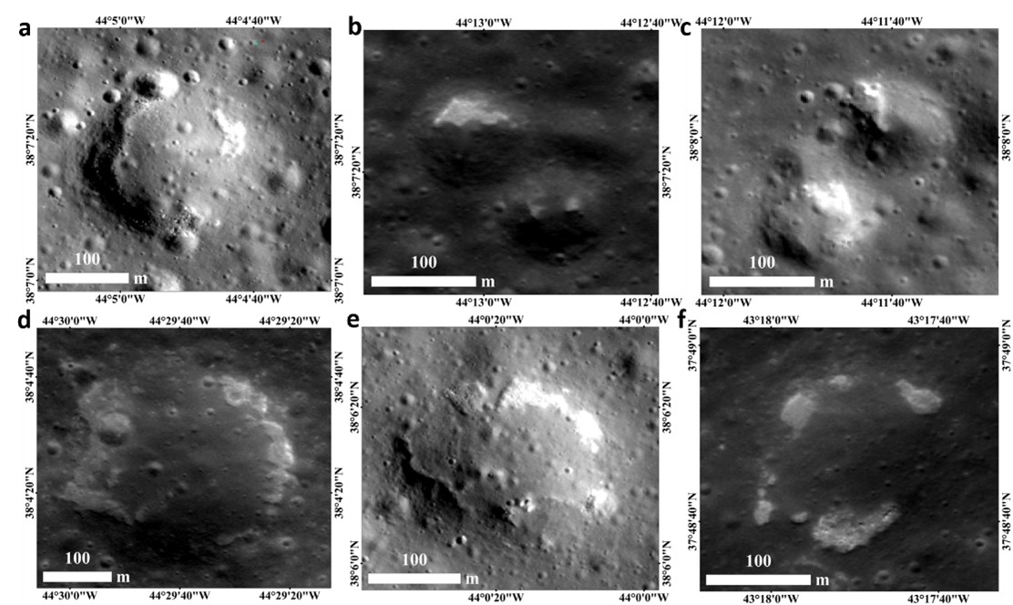 图2.在小撞击坑内部以及坑缘分布的IMPs (a) LROC NAC: M1265132719LE; (b) LROC NAC: M1132134006RE; (c) LROC NAC:M1129766068LE; (d) LROC NAC: M1101494777RE; (e) LROC NAC: M1265132719LE; (f) LROC NAC: M128507922RE