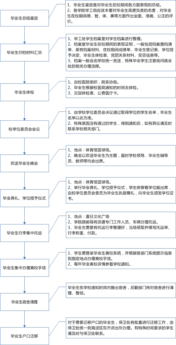 毕业离校工作涉及部门较多,需要办理的手续业务也多,对各部门和毕业生来说都是一项重要的任务。希望毕业生能先了解整个毕业离校的流程,顺利地办理离校手续。