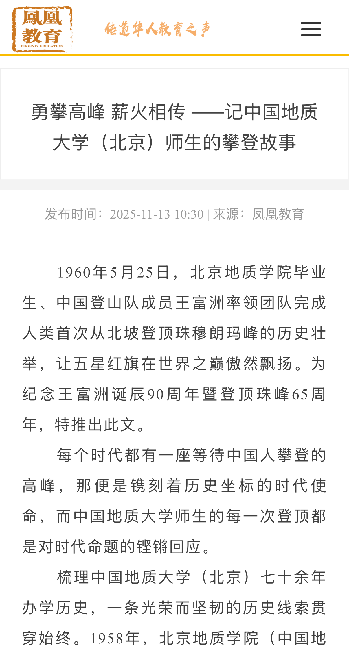 1960年5月25日,北京地质学院毕业生、中国登山队成员王富洲率领团队完成人类首次从北坡登顶珠穆朗玛峰的历史壮举,让五星红旗在世界之巅傲然飘扬。为纪念王富洲诞辰90周年暨登顶珠峰65周年,特推出此文。