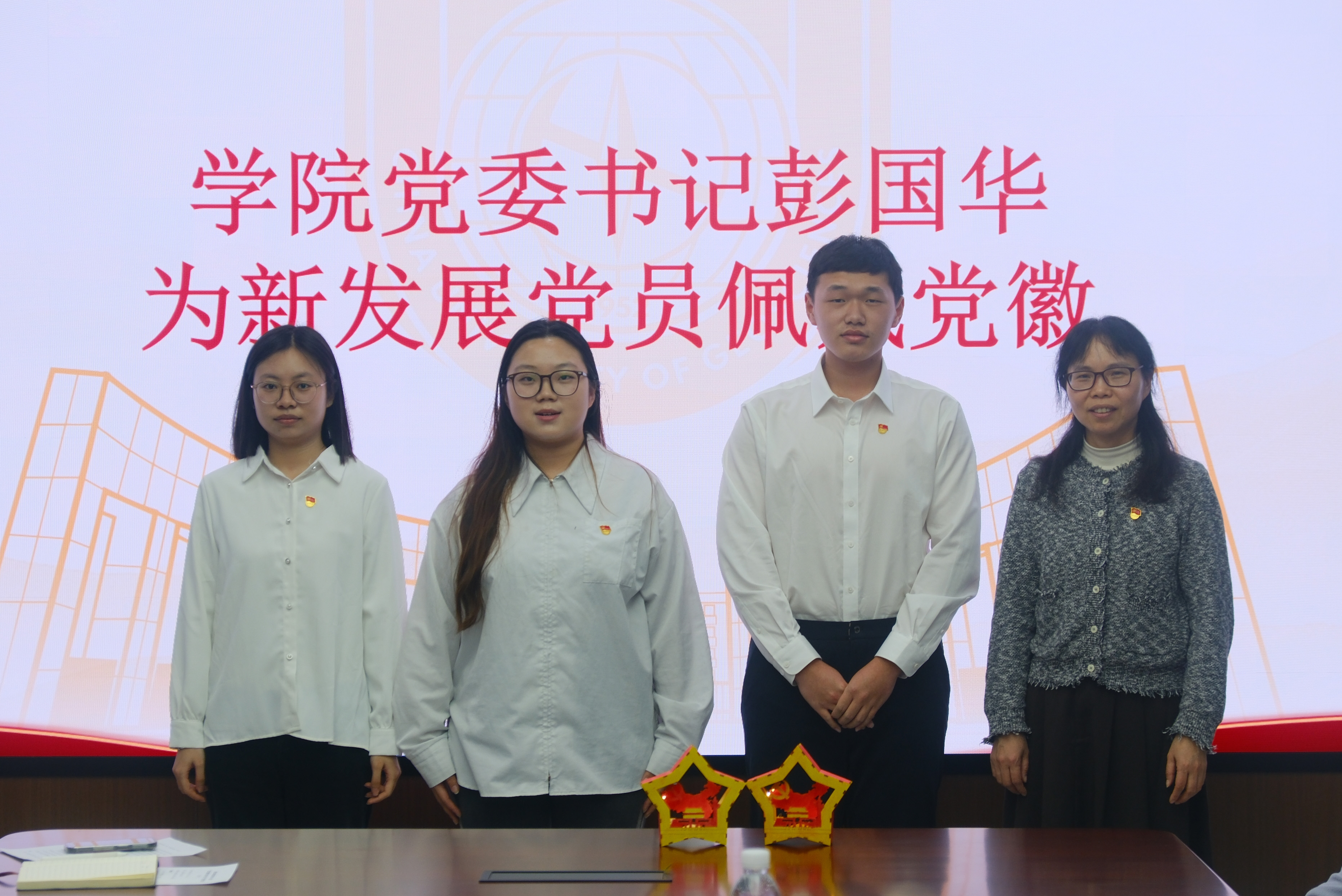 学院党委书记、支部理论导师彭国华为新发展党员佩戴党徽,勉励其铭记初心、践行誓言。