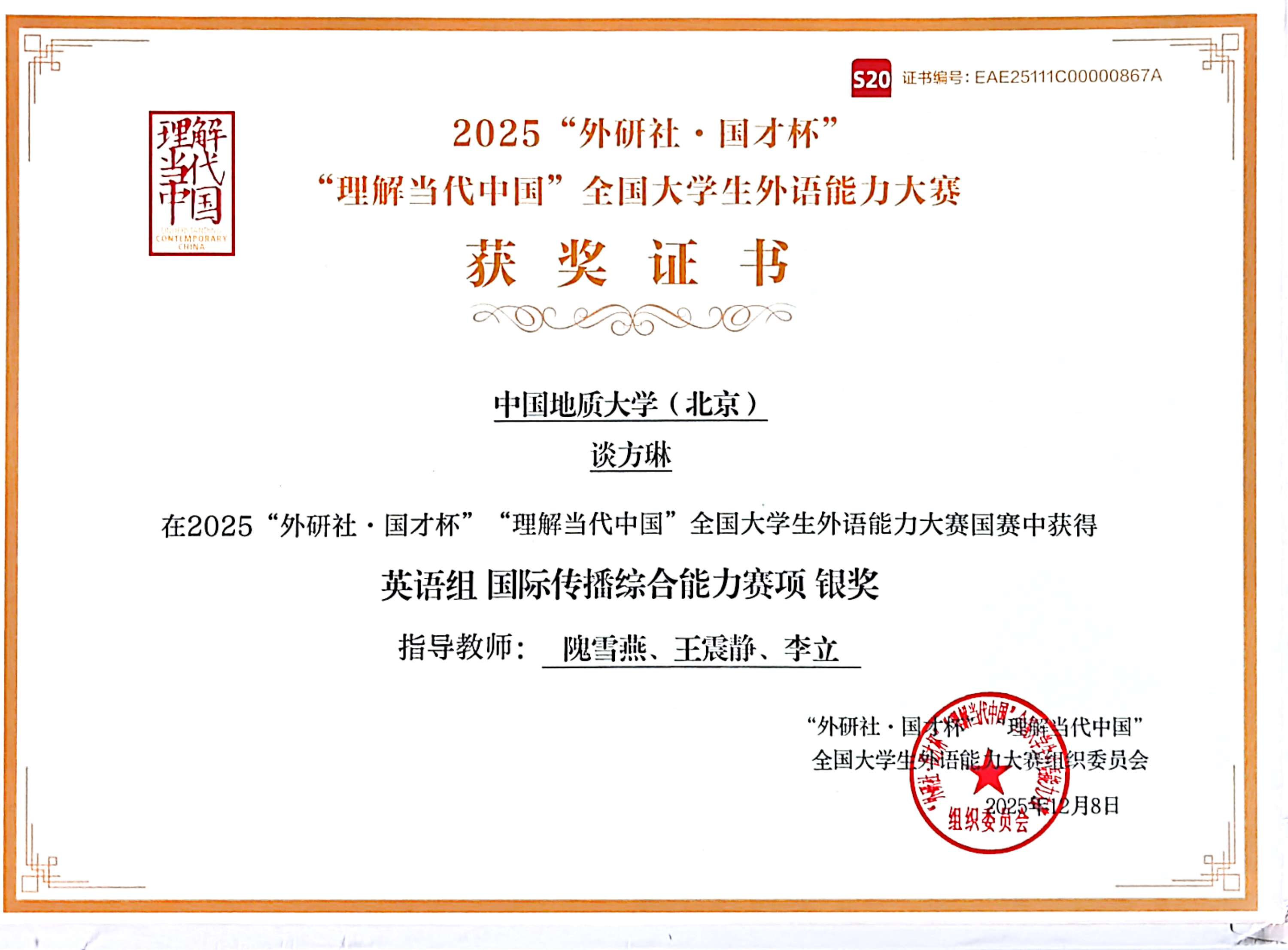 本次大赛由北京外国语大学主办、外语教学与研究出版社承办,吸引了全国1109名选手参赛。赛项涵盖阅读、翻译、写作、演讲等多个环节,要求选手通过多种形式解读中华术语、阐释文化内核、传递发展理念、讲好中国故事。谈方琳同学历经校赛、北京赛区赛和全国赛的层层选拔与激烈角逐,最终凭借扎实的语言功底和出色的国际传播素养脱颖而出。